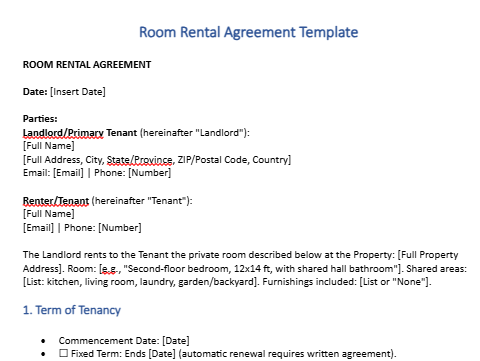 Identifies landlord (or primary tenant) and renter with full contact info, plus precise room/property descriptions (e.g., size, furnishings, shared spaces). This prevents disputes over access—USA templates often specify square footage/parking; UK ones define “common areas” explicitly.