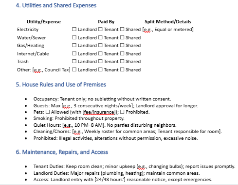 - House Rules: Cover pets, guests, smoking, noise, cleaning—vital for roommates to avoid conflicts.